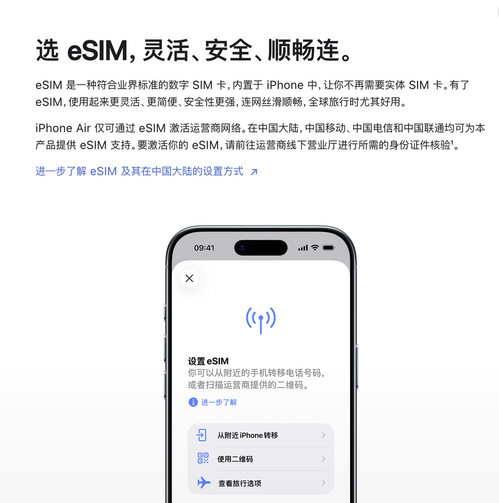 不過要留意,Apple 官方也提到,只有中國境內發售的 iPhone Air 才能使用中國三大電訊商包括中國聯通、中國移動及中國電信提供的 eSIM 服務。從外地 (包括香港) 購買的 iPhone Air 或其他支援 eSIM 的 iPhone 型號,都無法使用國內的 eSIM 服務,只能使用漫遊 eSIM 來使用流動網絡。另外,據國內網友的在包括淘寶及拼多多等平台都有銷售可在中國內地使用旅遊 eSIM,用戶可在不須 VPN 的情況下,自由地使用包括 Google 和 Amazon 等,目前在中國無法使用的網頁及服務。