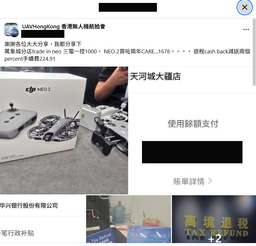 UAVHongKong 香港無人機航拍會 Facebook 群組,有玩家分享到深圳華強北的曼哈數碼廣場 DJI 專門店,以舊有的 DJI NEO 暢飛套裝 Trade-in 換新,並入手新的 Neo 2 暢飛套裝 (RMB ¥2,499),舊機回收價為 RMB ¥1,100。