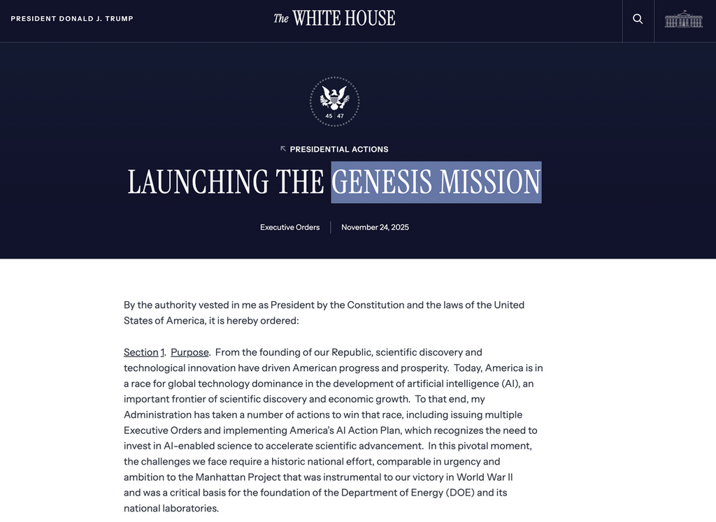 白宮官員將「創世任務」(Genesis Mission)形容為「世上最複雜、最強大的科學儀器」,目標是在十年內將聯邦研發的生產力和影響力翻倍。
